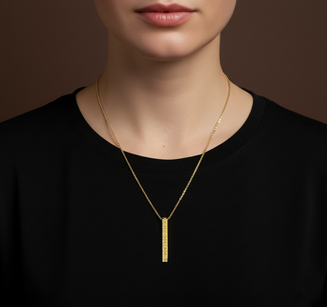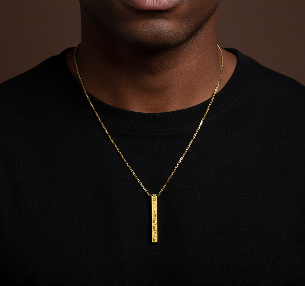 Gravée d’une succession de signes Adinkra soigneusement composés, la barre dorée crée un langage graphique à part entière — un talisman élancé, solide, mais d’une fluidité presque spirituelle.