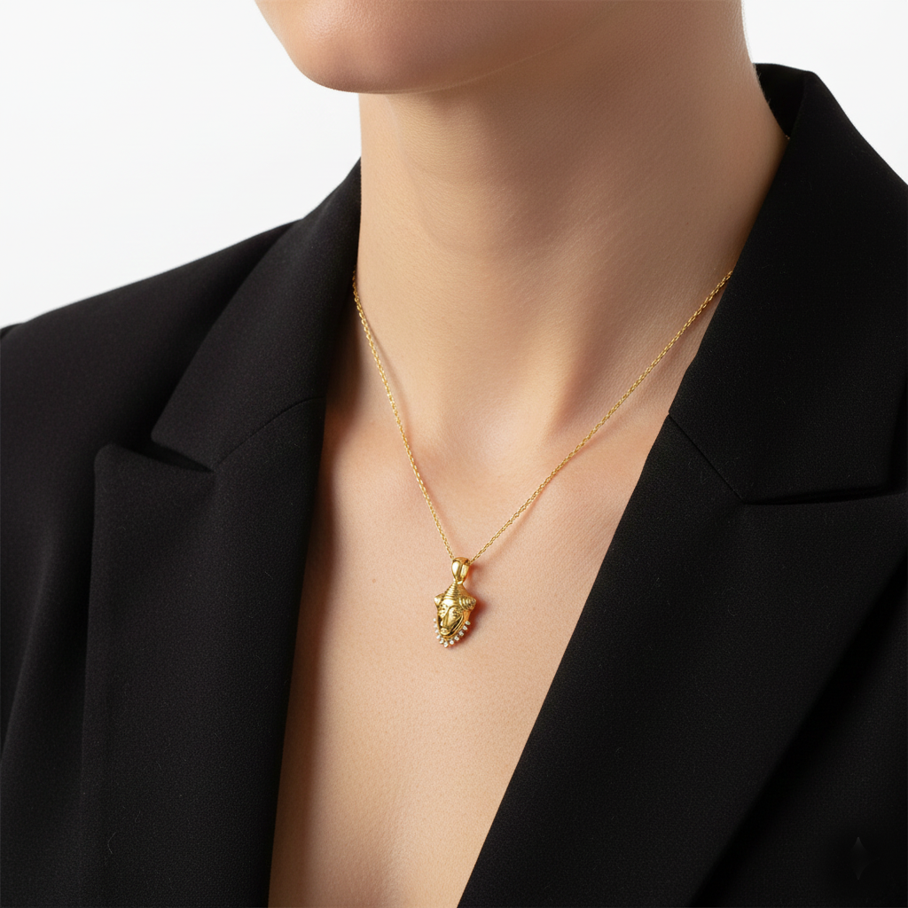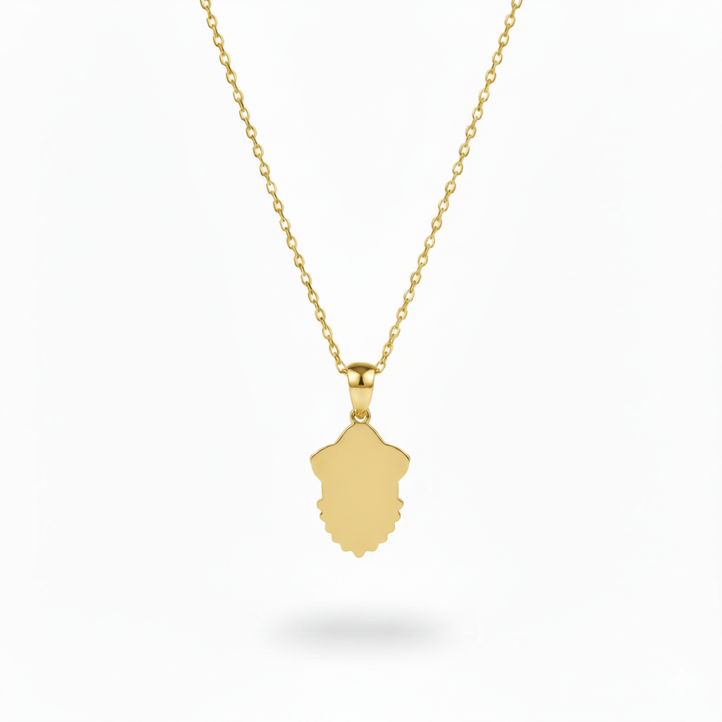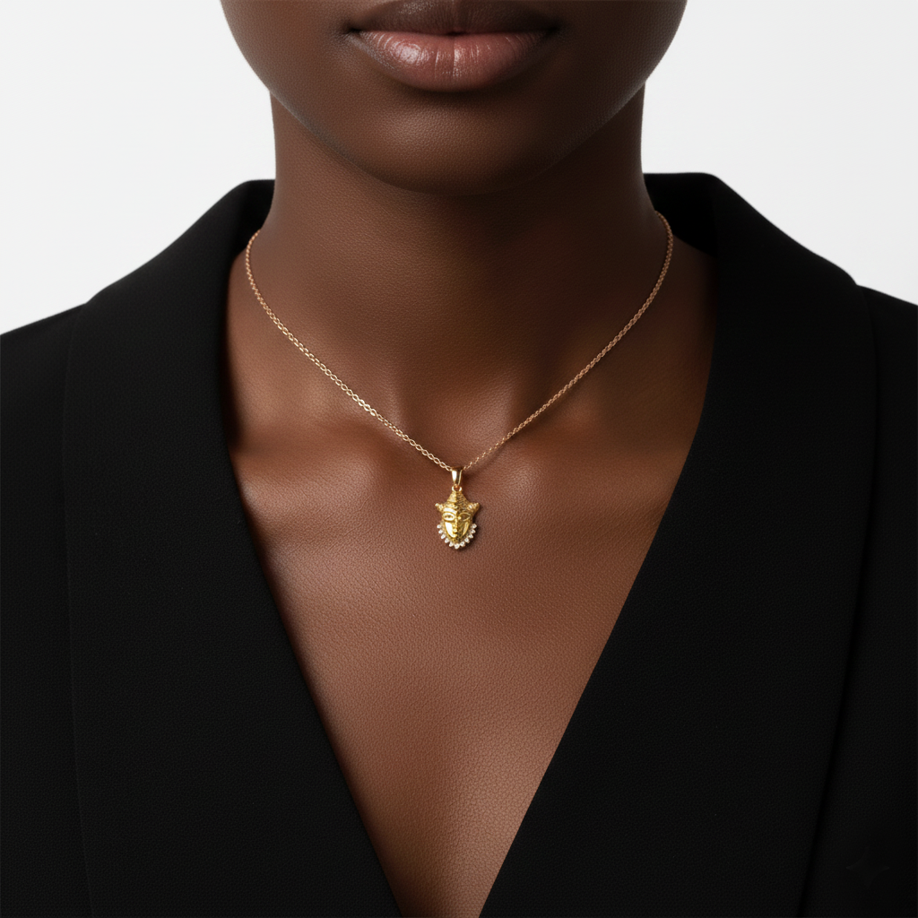 Son pendentif représente une interprétation contemporaine du masque Yoroko, symbole d’élégance, d’identité et de finesse.
